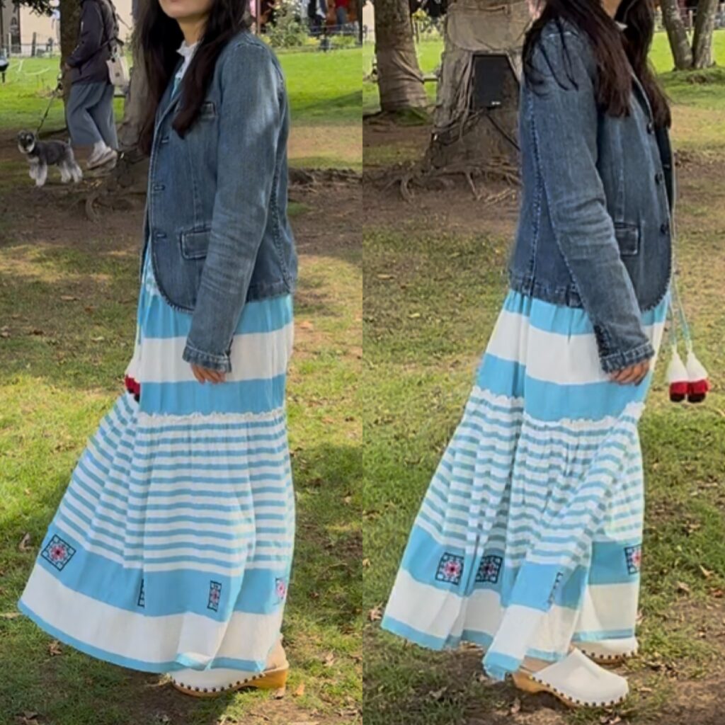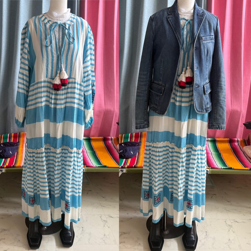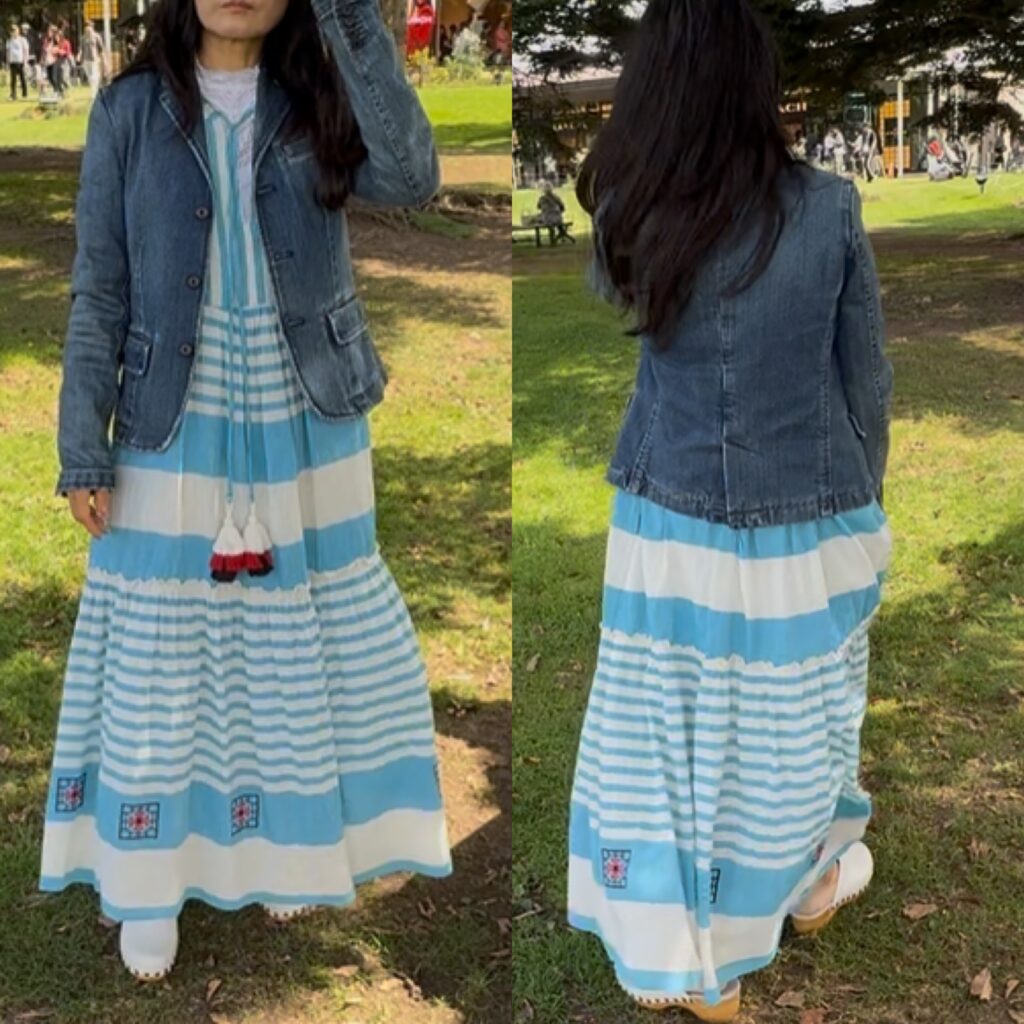 綺麗なブルーが特徴的な麻のワンピにデニムジャケットがよく合うと思いました。