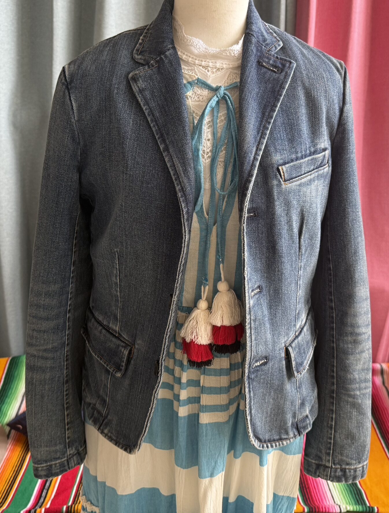 綺麗なブルーが特徴的な麻のワンピにデニムジャケットがよく合うと思いました。